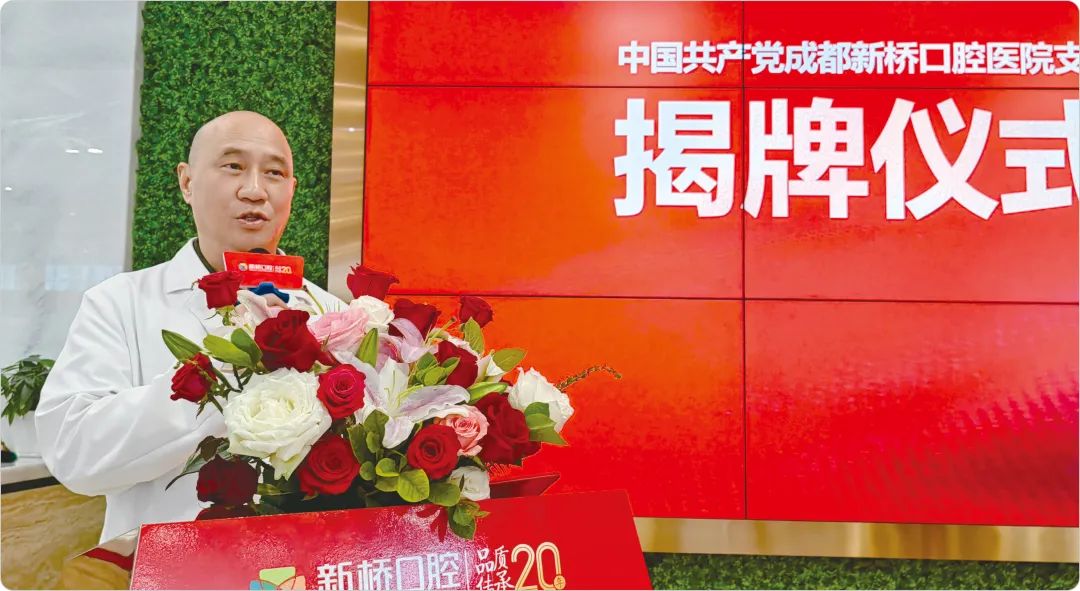 揭牌儀式上,華西種植專家/新橋口腔成都玉雙院區(qū)業(yè)務(wù)院長劉果生代表新橋口腔,向蒞臨現(xiàn)場(chǎng)的領(lǐng)導(dǎo)介紹了新橋口腔的發(fā)展歷程、學(xué)科建設(shè)、團(tuán)隊(duì)建設(shè)和開展的慈善公益等情況。