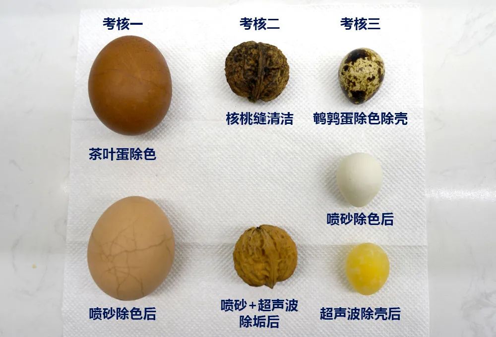 選手對鵪鶉蛋進(jìn)行噴砂除色、超聲波除殼操作