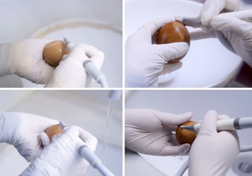 最后的終極檢驗(yàn)環(huán)節(jié),選手們需要在有限時(shí)間內(nèi)先除去鵪鶉蛋表面污漬、斑點(diǎn),然后通過超聲波去除鵪鶉蛋殼并保持蛋膜飽滿無破損。這不僅考驗(yàn)潔治力度與手速,更是對選手的潔牙手法技巧、潔牙針尖切入角度和心態(tài)的綜合挑戰(zhàn)。