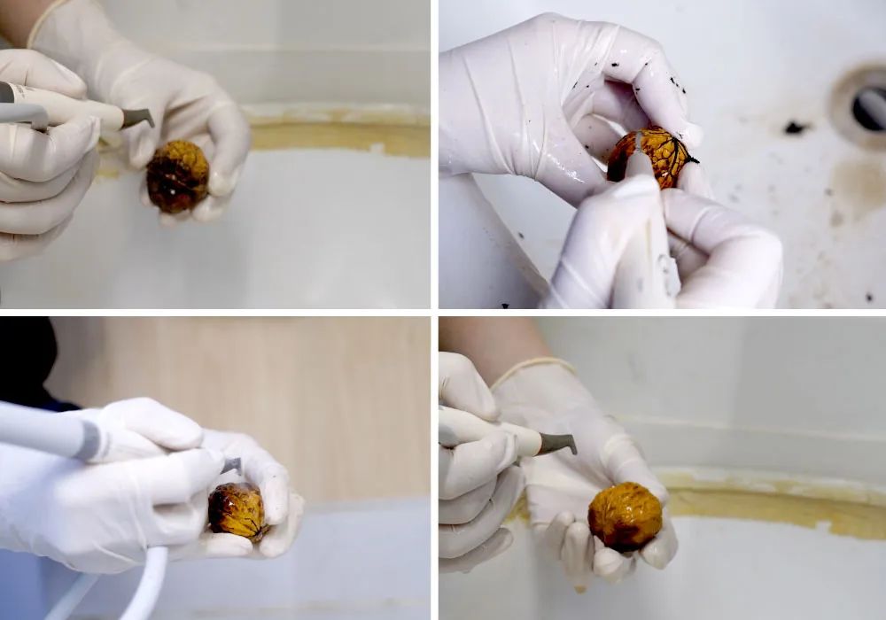選手利用噴砂+超聲波進(jìn)行核桃縫清潔
