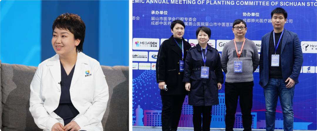 左圖:張潔在“四川觀察”直播間解讀種植牙集采政策 右圖左二:張潔參加四川省口腔種植專委會2021年冬季學術年會