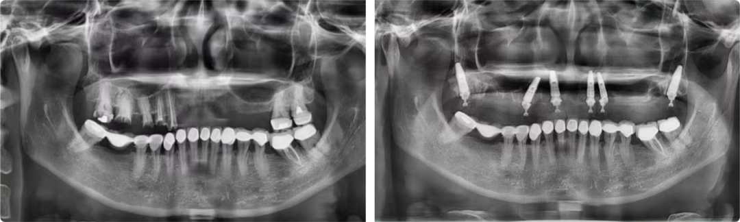 這臺手術歷時三個半小時,比平時多花了一倍多時間,所幸的是六顆種植體全部成功負重。術后,患者順利戴冠,咬合良好。