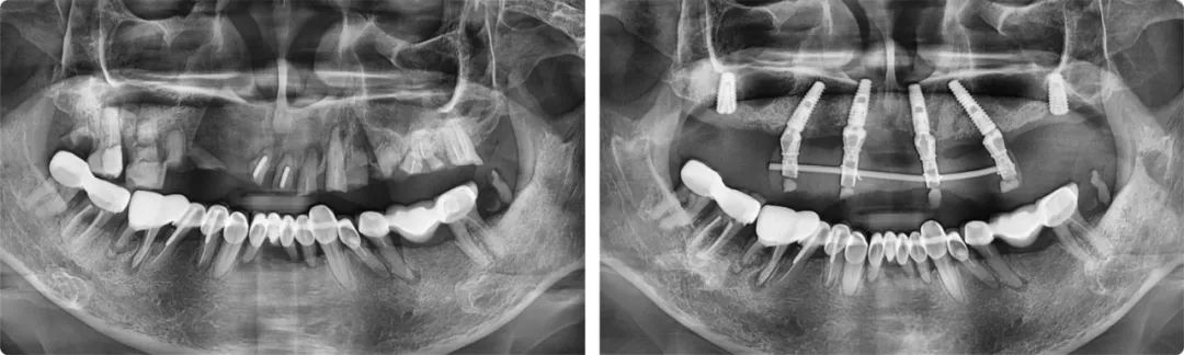 葉宏解釋了這樣做的原因:標準的無牙頜種植上頜一般是6-8顆,下頜4-6顆,如果口腔條件允許,他會建議患者至少要種六顆,這樣牙槽骨受力更加均勻。如果只種四顆,后期的維護成本相對較高。分兩步走的治療方案雖然麻煩一些,但保障了種植牙的遠離穩(wěn)定性。