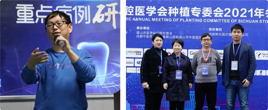 左圖:葉宏在新橋口腔重點病例研討會做主題分享 右圖右二:葉宏參加四川省口腔種植專委會2021年冬季學術年會