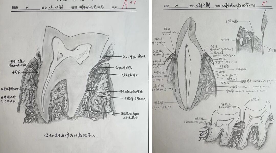 口腔專業(yè)對學(xué)生的動手能力要求很高,“為了訓(xùn)練手部的控制能力、協(xié)調(diào)性和靈活性,我們從大一就開始練習(xí)織毛衣、雕粉筆頭,做各種精細(xì)手工活,每一屆都是這樣傳下來的。上口腔解剖課時,總會出現(xiàn)一些大神級的牙齒素描,同學(xué)們很多都是多才多藝。”