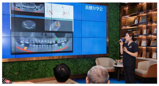 在觀眾專心致志聽講中,手術室已準備就緒。上午10點24分,直播大屏上開始實時轉播易華波主任術中的每一個細節(jié)——從局部麻醉到創(chuàng)口預備,再到種植體精準植入,最后縫合創(chuàng)口,他用近30年口腔臨床經驗,為大家展示了一場高水平的“種牙真功夫”。