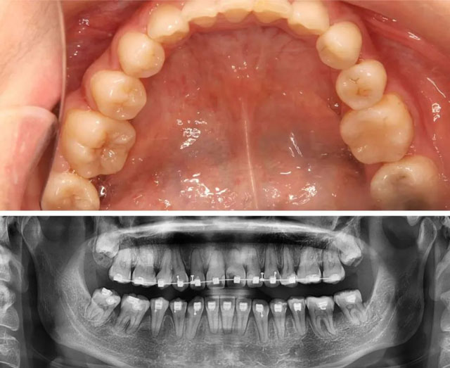 她的下前牙應(yīng)該是第一次矯正時(shí)拔除的,雙側(cè)6號(hào)牙缺失是第一次矯正完成之后才出現(xiàn)的問(wèn)題,同時(shí),她下頜左側(cè)智齒為阻生牙,橫著長(zhǎng)在牙槽骨里,右側(cè)智齒只萌出了部分,整體情況比較復(fù)雜。