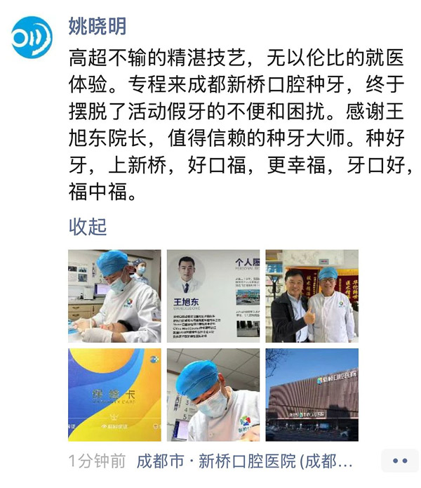 2025年3月13日,年逾60歲的姚曉明教授在新橋口腔成功完成了第四次種牙治療。一如既往的高品質(zhì)服務(wù),讓他忍不住在朋友圈贊嘆:“高超不輸?shù)木考妓嚕瑹o以倫比的就醫(yī)體驗(yàn)。”與此同時(shí),他還分享了自己與新橋口腔之間的深厚緣分。