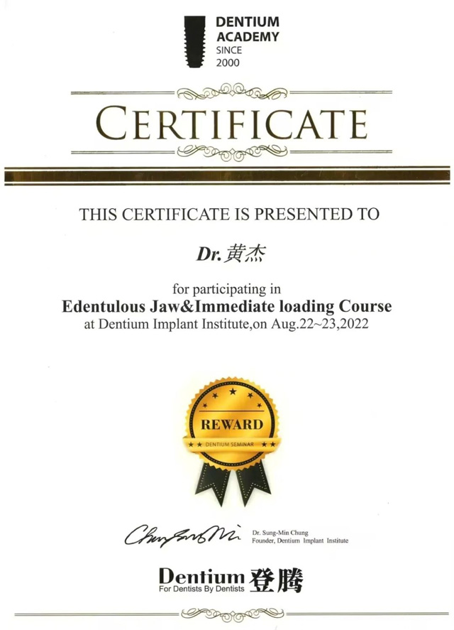2022年,黃杰獲得登騰無牙頜種植培訓(xùn)班證書