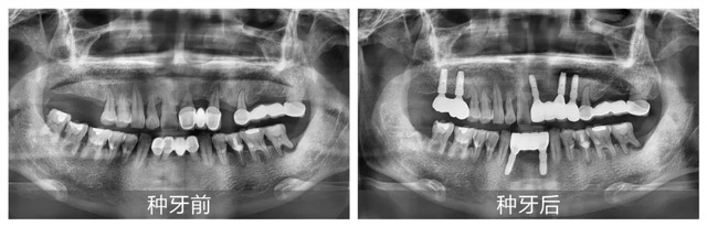 經(jīng)CBCT全景檢查所見(jiàn),謝海洋主任發(fā)現(xiàn)卞先生存在多顆牙缺失、殘存牙體伴有嚴(yán)重骨吸收,且多顆修復(fù)體失效等問(wèn)題,亟待通過(guò)種植牙重建咬合功能。針對(duì)顧客異地就醫(yī)、就診時(shí)間有限的情況,謝海洋主任為卞先生制定了“上下頜多顆即拔即種+連冠修復(fù)”的個(gè)性化種植方案:下頜種植2顆基牙支撐2顆連冠,上頜右側(cè)種植2顆獨(dú)立基牙,上頜前側(cè)種植3顆基牙連冠修復(fù)1顆。