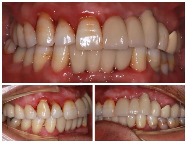 因牙周病的困擾,卞先生僅30多歲牙齒便接連松動(dòng)脫落。2012年曾在伊犁某口腔機(jī)構(gòu)進(jìn)行烤瓷固定橋修復(fù),但受限于當(dāng)?shù)蒯t(yī)療條件,且隨著時(shí)間推移,上下頜前側(cè)的多處修復(fù)體逐漸松動(dòng),加上上頜1顆前牙和右側(cè)2顆磨牙的脫落,導(dǎo)致卞先生的咀嚼功能?chē)?yán)重受損。