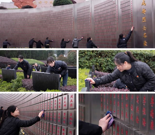 在紀(jì)念碑后方,是鐫刻著烈士姓名的《成都烈士名錄》紀(jì)念墻。大家用毛巾仔細(xì)擦拭著烈士姓名,并自發(fā)走進(jìn)烈士墓區(qū),通過擦拭墓碑、清理枯枝雜草、瞻仰烈士生平事跡的方式,向革命英烈們表達(dá)崇高敬意和無限哀思。
