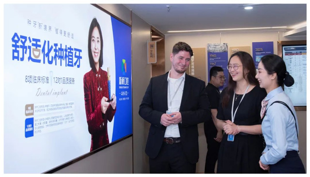 通過院內(nèi)科普資料,Tobias Speicher一行首先了解了新橋口腔舒適化種植牙兩項核心特色——“金標(biāo)準(zhǔn)”和“12對1”品質(zhì)服務(wù)。新橋口腔舒適化種植牙金標(biāo)準(zhǔn),是一套覆蓋術(shù)前、術(shù)中、術(shù)后的全流程臨床規(guī)范,通過八大核心環(huán)節(jié)確保手術(shù)安全與舒適體驗。而“12對1”品質(zhì)服務(wù),是指由12個專業(yè)崗位組成服務(wù)團(tuán)隊,為每位種牙顧客提供全程專屬服務(wù)。Tobias Speicher對新橋口腔將臨床規(guī)范與人文關(guān)懷完美結(jié)合的診療模式表示高度贊賞,認(rèn)為其:“不僅體現(xiàn)了醫(yī)療專業(yè)度,更彰顯了醫(yī)療服務(wù)的溫度。”