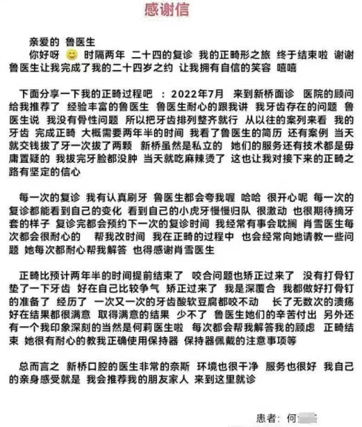 “謝謝魯醫(yī)生讓我完成了我的二十四歲之約,讓我擁有自信的笑容……”日前,新橋口腔正畸??浦魅昔斁S希收到了一封復(fù)診顧客的電子版感謝信。在信中,顧客何女士訴說了自己的正畸經(jīng)歷,字里行間充滿了溫暖和感謝。