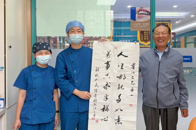 日前,新橋口腔西寧院區(qū)種植專業(yè)組副主任黃清川收到了一幅墨香四溢的書法作品。作者李秋成叔叔今年84歲,是新橋口腔西寧院區(qū)的一位種牙回頭客。 初次結(jié)緣:重獲口福,信任由此生根 回……