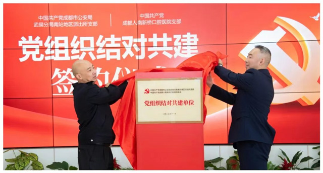 成都市公安局武侯分局南站地區(qū)派出所黨支部書記、所長付亮,成都市公安局武侯分局南站地區(qū)派出所教導員董琦,成都市公安局武侯分局南站地區(qū)派出所副所長楊濤,成都人南新橋口腔醫(yī)院黨支部書記左強國,成都新橋口腔醫(yī)院黨支部書記蔣越,新橋口腔醫(yī)務院長陳曉愚及雙方黨員代表參加了本次簽約儀式。