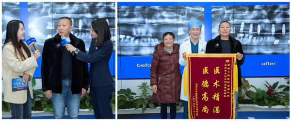 溫馨互動(dòng)環(huán)節(jié)中,70歲的李先生作為曾接受舒適化半口種植的老顧客,也登臺(tái)分享了他的感受:“新橋口腔是央企投資的,這點(diǎn)讓我很放心。李主任技術(shù)很好,真的一點(diǎn)沒(méi)有感覺(jué)到痛,效果非常滿(mǎn)意!”隨后,李先生和老伴將一面寫(xiě)有“醫(yī)術(shù)精湛·醫(yī)德高尚”的錦旗親手贈(zèng)予李陽(yáng)軍主任,以表達(dá)對(duì)其醫(yī)療團(tuán)隊(duì)的深深謝意。從初次體驗(yàn)的認(rèn)可到長(zhǎng)期信賴(lài)的回饋,新橋口腔的舒適化技術(shù)再次贏得了患者的真情印證。