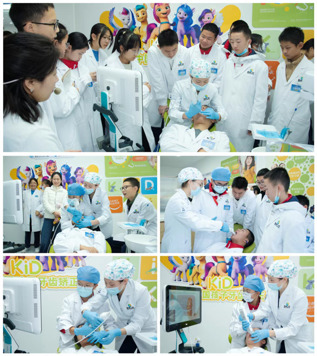 在醫(yī)護(hù)人員的指導(dǎo)下,“醫(yī)生”們戴好口罩、帽子、手套…..一切準(zhǔn)備就緒后正式開始。通過短短幾分鐘的掃描,屏幕上即刻呈現(xiàn)“顧客”清晰的口腔三維立體圖像,齲齒、牙結(jié)石、色素等口腔狀況一目了然。這項高科技體驗讓同學(xué)們連連驚嘆,直呼這臺口掃儀太神奇!
